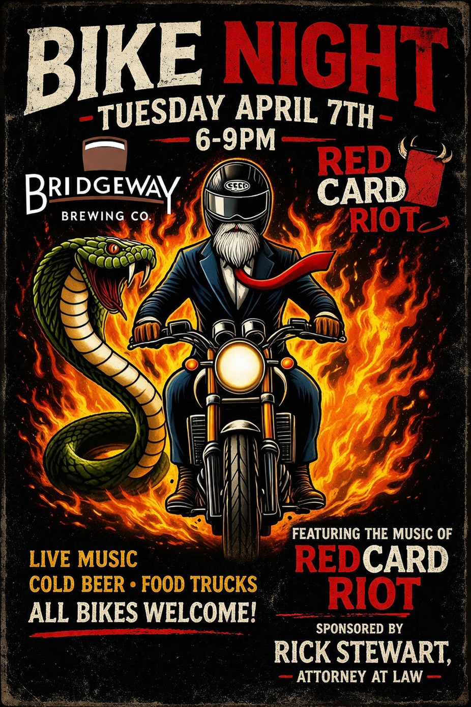 #BikeNight #BridgewayBrewing #MotorcycleLife #RideOrDie #LiveMusicVibes #RedCardRiot #FoodTruckLife #CraftBeerLovers #BikerCommunity #TwoWheels #LocalEvents #GoodTime