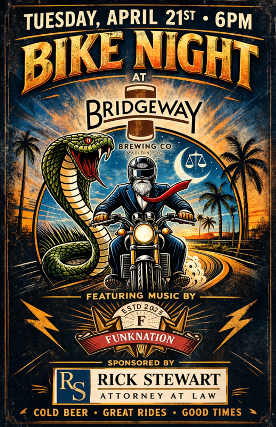 Rev it up and roll out to Bridgeway Brewing Co. on Tuesday, April 21st at 6PM for a night built for riders, music lovers, and anyone chasing a good time.