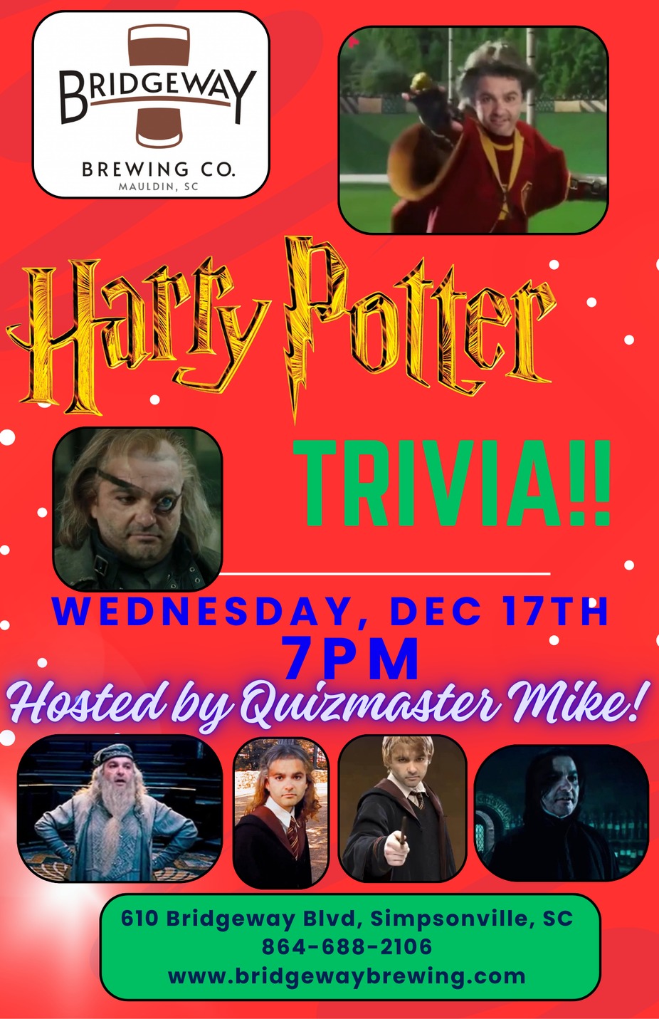 Calling all Potterheads! Join us for Harry Potter trivia on Wednesday, December 17th at 7pm. Test your Harry Potter knowledge against the great and powerful Quizmaster Mike. #harrypotter #greenvilletrivia